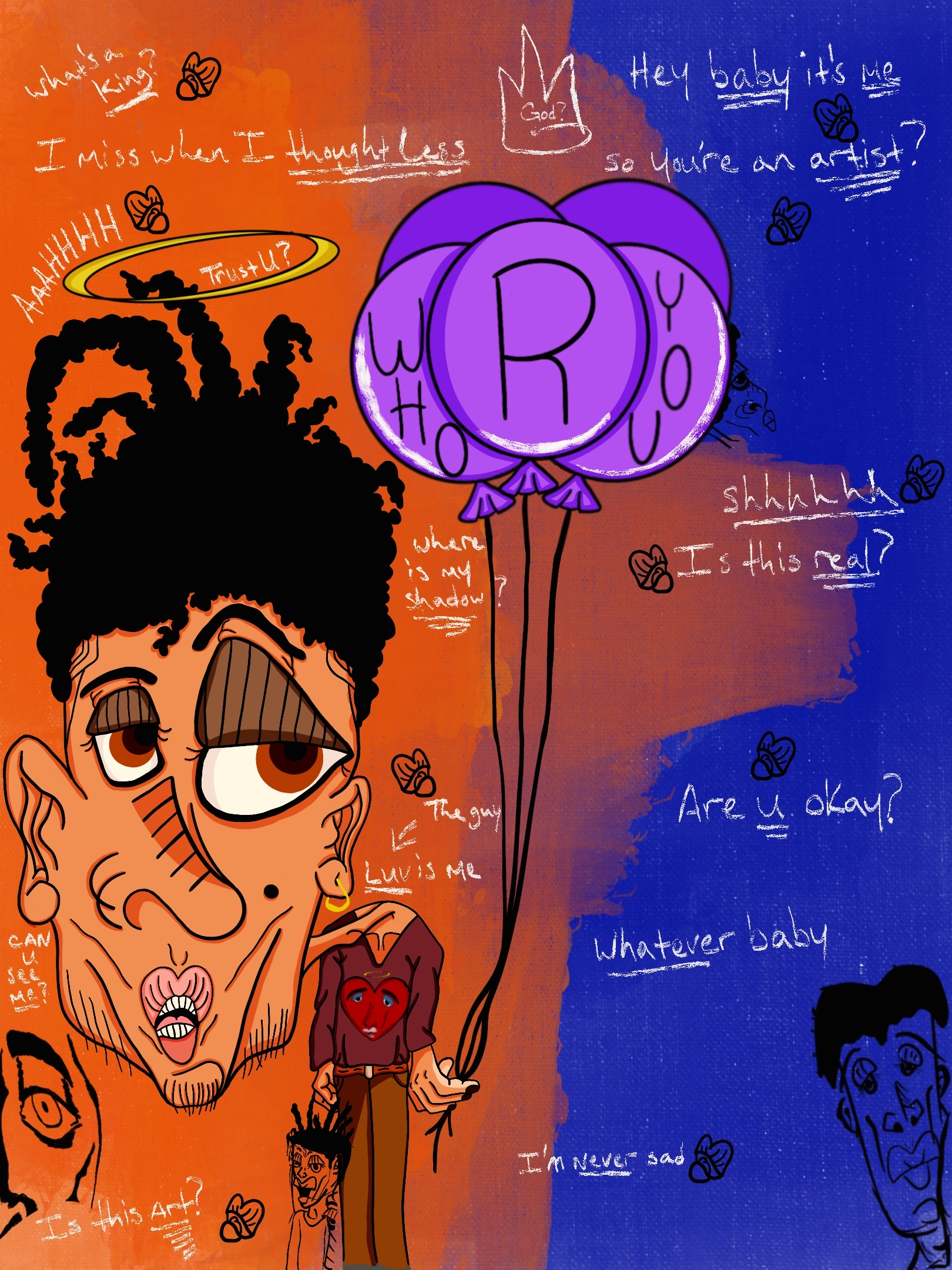 of self-discovery. He clutches a vibrant balloon, its buoyant presence inviting introspection and